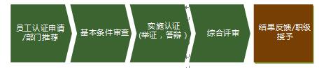 員工自行填寫認證申請,或由部門推薦申請,人力資源部按條件進行資格審查,邀請上級、專委會進行評估,或采用提交舉證材料與答辯的形式完成。(爲了使認證工作便捷有效,針對初級人員,通過資格審查和考試即可完成認證;針對中高級人員,可增加答辯環節。)